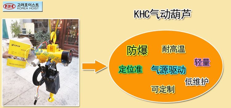 龙海起重工具代理韩国KHC气动葫芦10余年,了解更多型号、优势、定制、价格、货期来目录页: http://www.ytlhqz.net/index.php/product?pinpaiid=62 http://www.ytlhqz.net/index.php/product/show/59