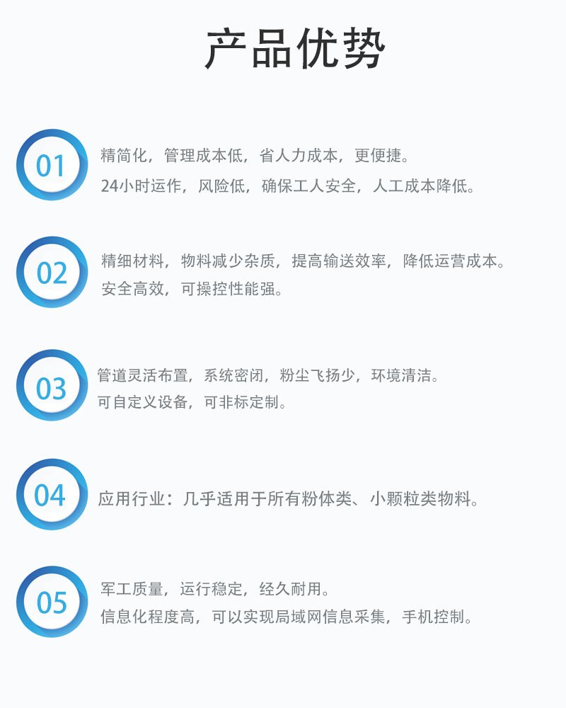 适用物料:不同的物料、不一样的工艺需要不同的气力输送系统。研发人员会认真倾听每个客户的具体需求,研究每个物料特性,通过丰富的经验和可靠的实验,以严谨并创新的设计,设计出科学的**化解决方案。同时非常愿意与客户共同探讨易碎、易粘物料、易爆、超硬、超轻、超细等特殊物料的输送解决方案。