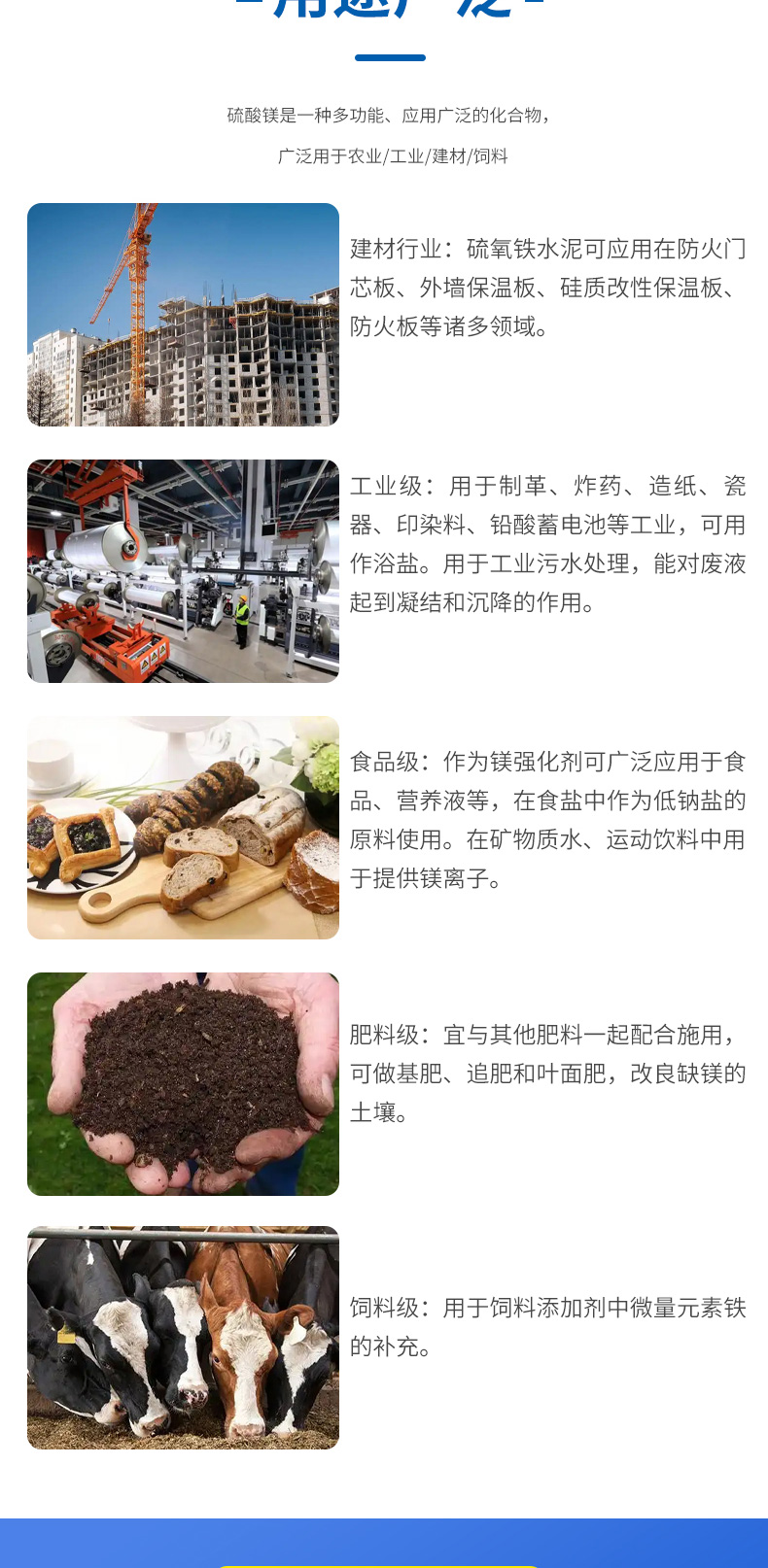 工业/农业/饲料/建材,用于制药以及印染工业,也可做干燥剂、饲料、肥料或复合肥料,也是生产氧化镁原料