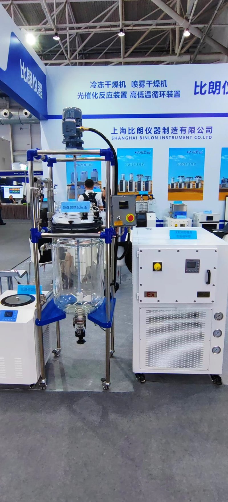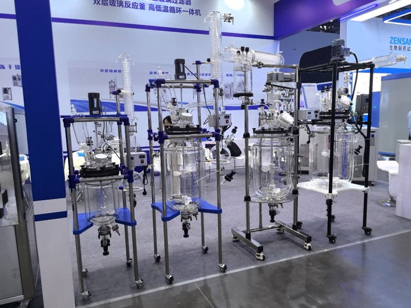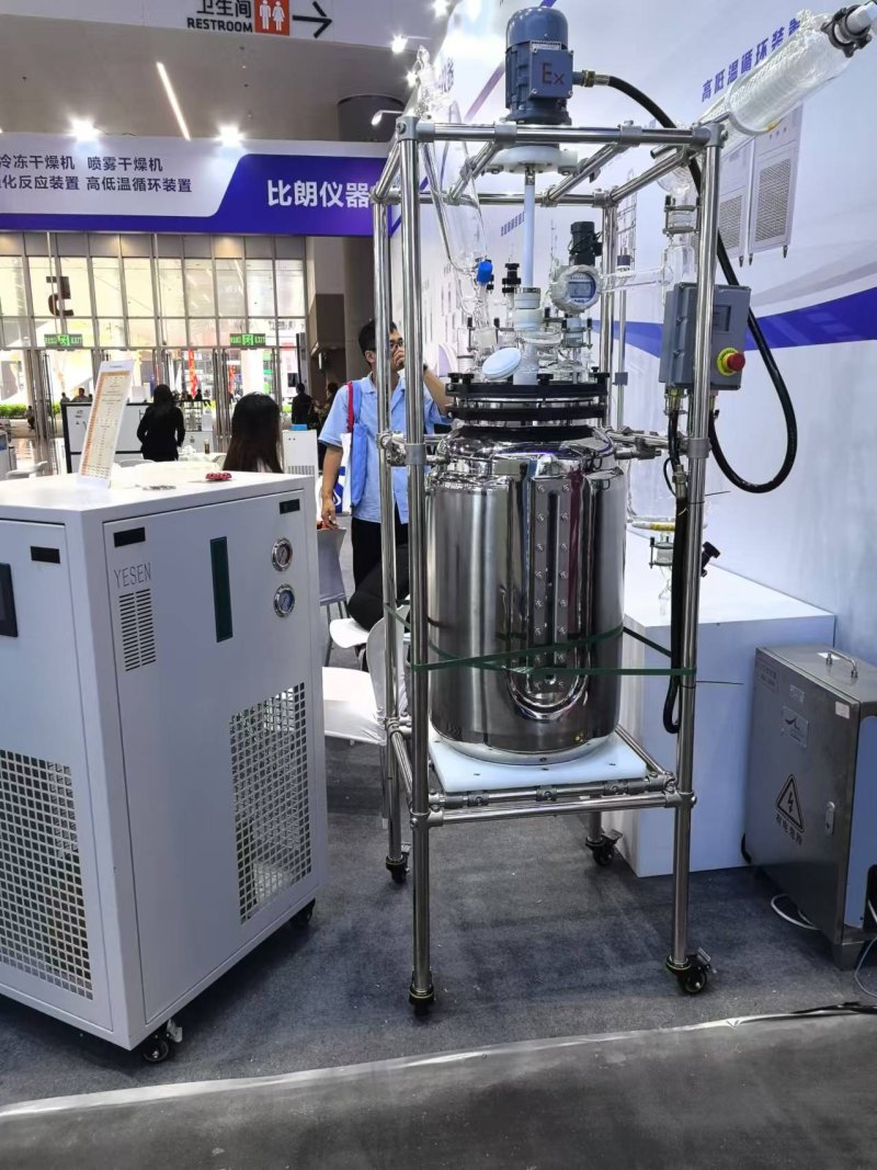 ●整体不锈钢立柱移动式框架结构,五口反应釜盖,具回流、加液、测温等全套玻璃。