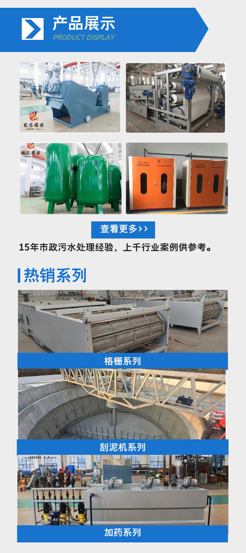 刮泥机、吸泥机、格栅机、一体化净水设备、压滤机、气浮机、加药装置、压榨设备、滗水器、链板刮泥机、浓缩脱水机、皮带输送机、污泥脱水机、卧螺离心机、螺旋压榨机、污水处理设备、高密池刮泥机、絮凝斜管沉淀池、废水处理设备、板式膜格栅机、周边传动刮泥机、中心传动刮泥机、回转式格栅机、过滤器