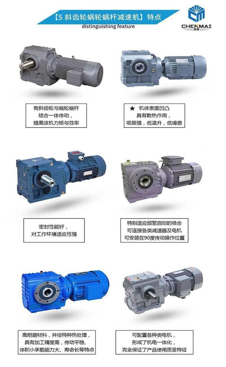 1、S系列斜齿轮蜗杆减速电机具有很高的科技含量,有斜齿轮与蜗轮蜗杆结合一体传动,提高该机力矩与效率。该系列产品规格齐全,转速范围广,通用性好,适应各种安装方式,性能安全可靠寿命长,实施了国际标准要求。