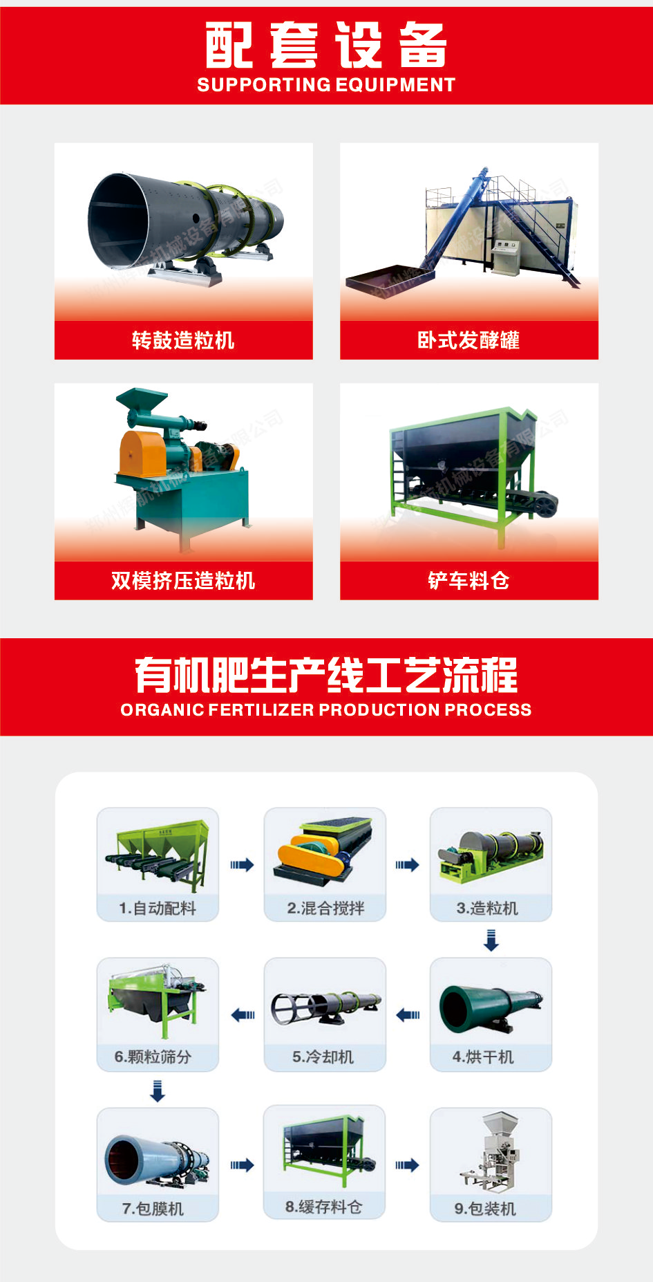 有机肥设备、翻堆机、翻抛机、粉机、造粒机、抛圆机、搅拌机、筛分机、料仓、配料机、烘干机、冷却机、输送机、控制系统、包膜机、码垛机、包装机、发酵罐