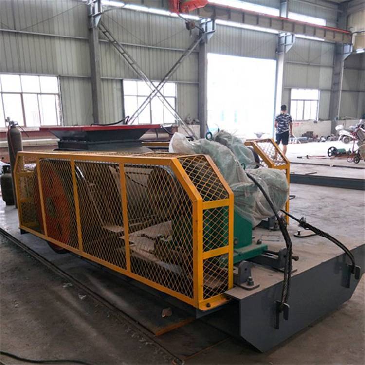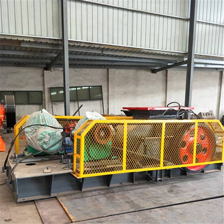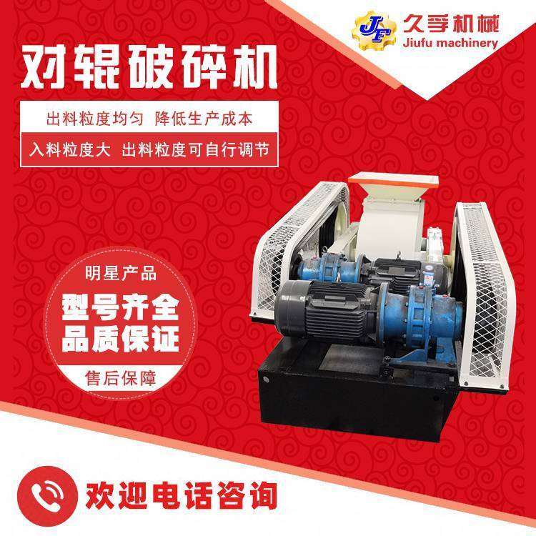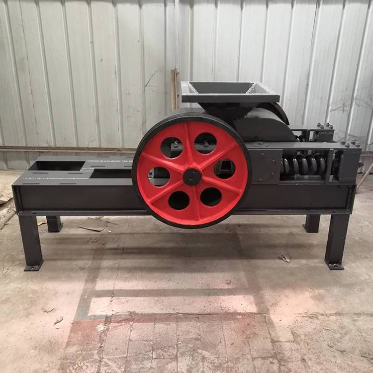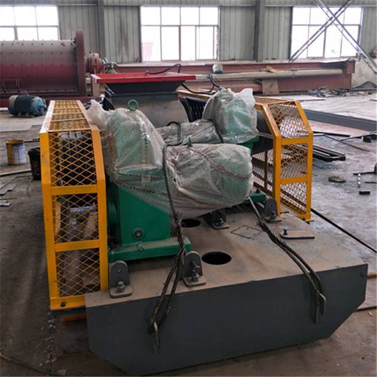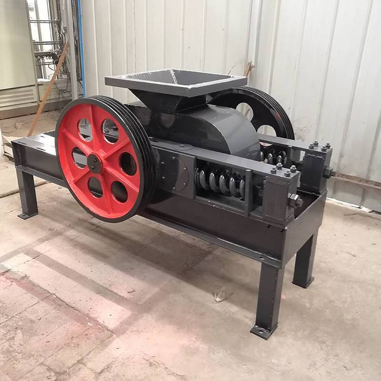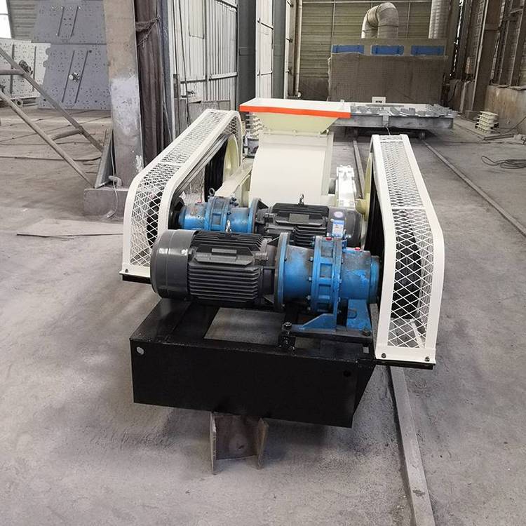 由两个电动机驱动,通过三角皮带传动到槽轮上拖动辊轮,按照相对方向运动旋转。在破碎物料时,物料从进料口通过辊轮,经碾压而破碎,破碎后的成品从底架下面排出。