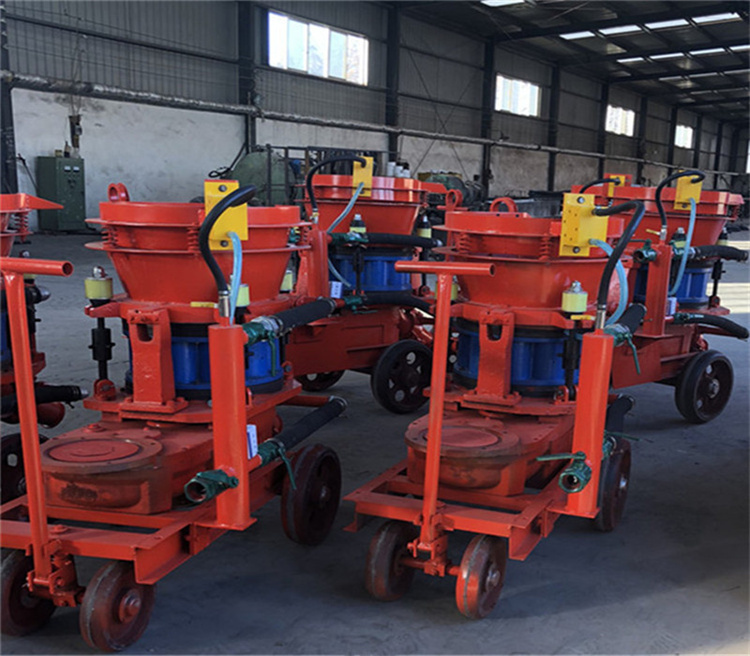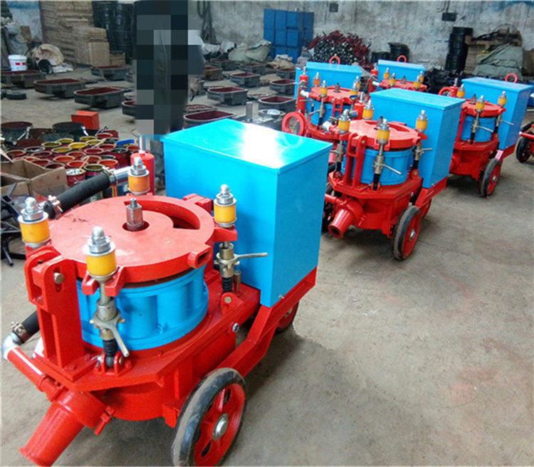 干式喷浆机往料斗里加入的被喷射的料(混凝土、水泥等)是干的,通过空压机施加压力,把干料送到喷头处,喷头处有进水管,干料在喷头处经过与水混合然后喷射出去。