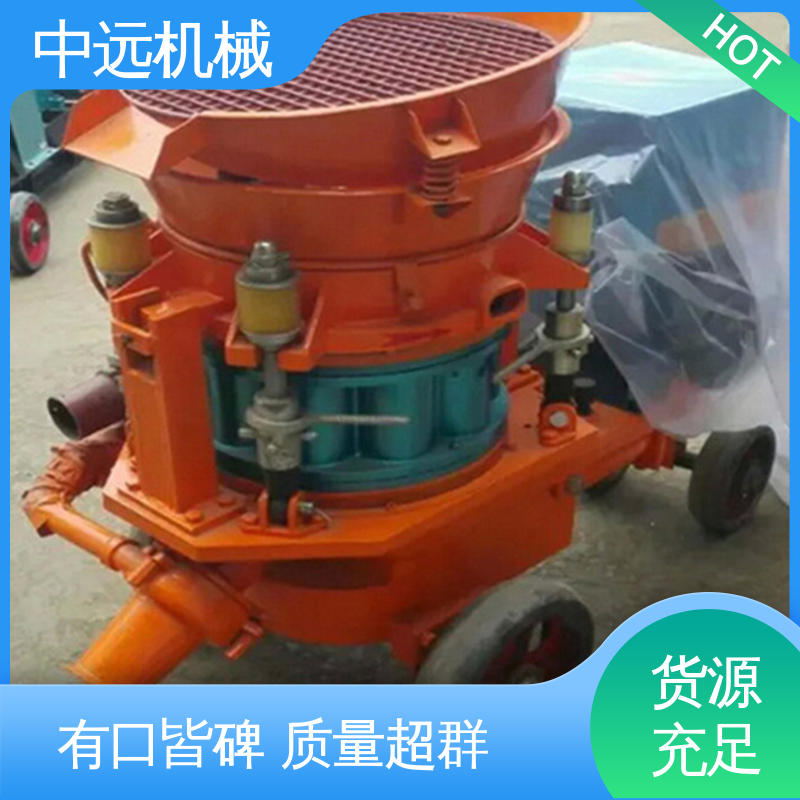 该机既可用于湿喷,也可用于干喷及各类纤维喷射作业。喷射混凝土是利用压缩空气,将按一定配比的混凝土拌和料通过管道输送并高速喷射到受喷面上凝结硬化,从而形成混凝土支护层。近年来,喷射混凝土技术以其简单的工艺、新型的效应、经济的造价和快捷的施工速度,在建筑、铁公路隧道施工、矿山井巷建设、边坡加固等领域广泛应用。直通转子式不粘结料腔,出料通畅,高产省时。低压、低速旋流风、稀薄流输送,料流均匀、稳定,喷层强度高。四点弹性补偿夹紧,密封效果好,机旁粘尘少,易损件寿命长。