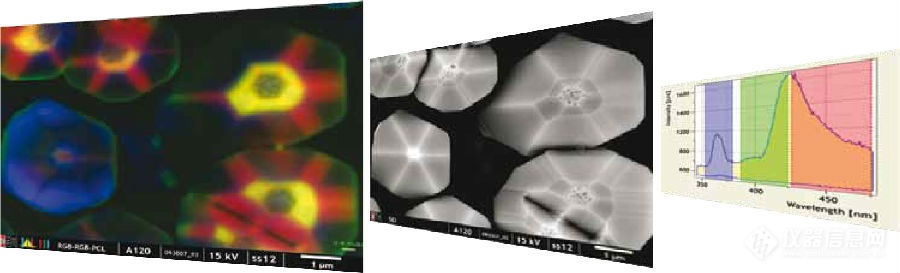 | ■CL光谱:使用CL测量光谱时,可在电镜下观察并选择待测样品区域。 | ■快速CL成像:将扫描电子束与您的光谱仪同步,提供快速成像方案。使用HCLUE系统测量的GaN样品,测量中使用了超快SWIFTTM成像模式。 |