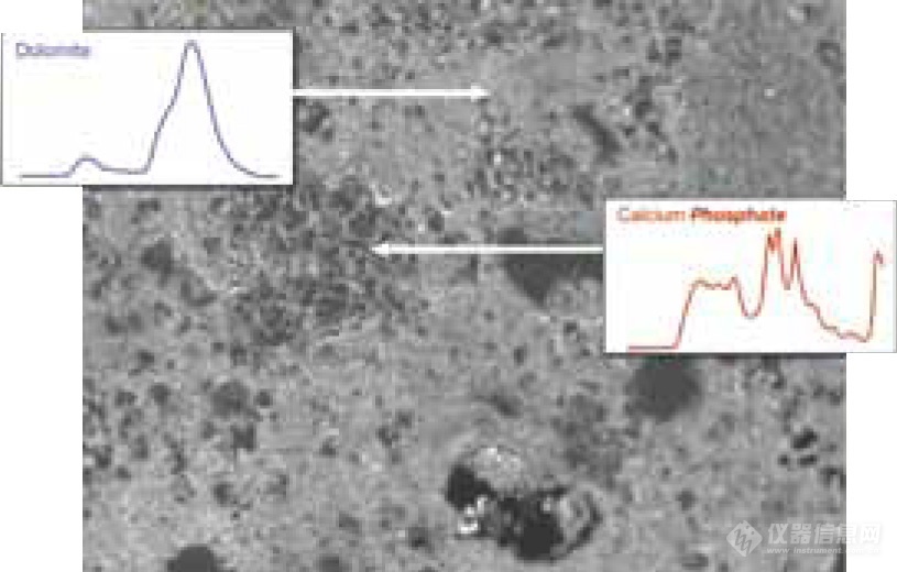 ![]() 矿物样品中的白云石和磷酸钙。测量使用Flex-CLUE系统,配备iHR320光谱仪和开放电式CCD探测器。感谢Prof A. Jambon, UPMC France提供数据 |