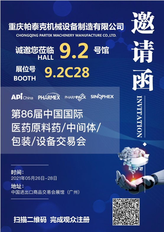第86届中国医药原料药中间体包装设备交易会(API&CHINA-PHARM)将于2021年5月26-28日在羊城广州中国进出口商品交易会展馆隆重召开,制剂、粉体工程专家— 机械设备制造有限公司将重磅亮相。