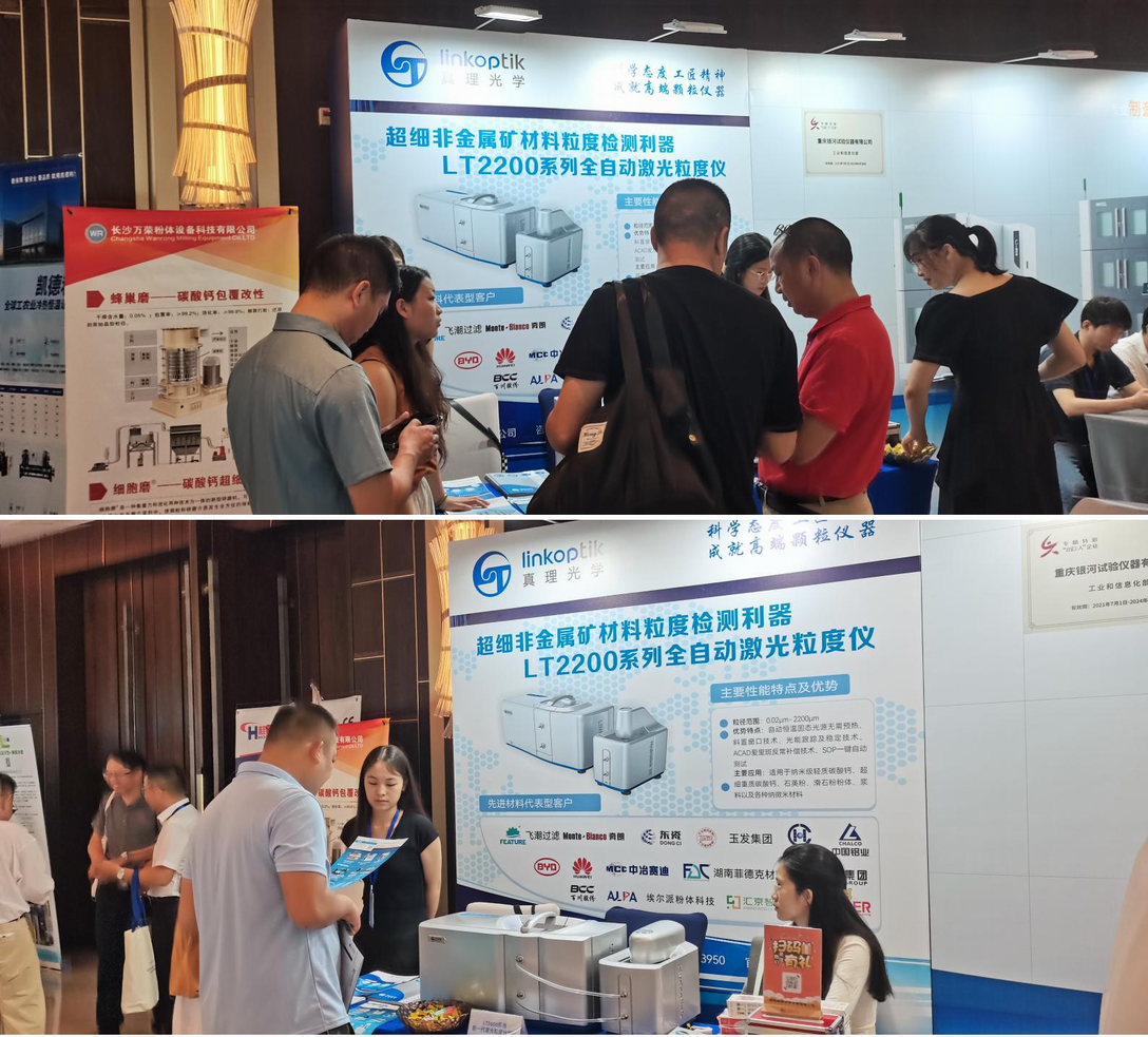本次大会主会场门口通道设置专门的展台,现场为广西壮族自治区政府、百色市政府领导、当地企业以及来自全国各地的非金属矿领域的专家学者和设备同行展示了真理光学在超细非金属矿粉体领域深受大家喜爱的LT系列全自动激光粒度仪产品。经过多年的发展,真理光学粒度仪仪器产品凭借精美的外观、出色的测试性能和良好的口碑应用遍及全国,深受广大专业用户欢迎和喜爱。