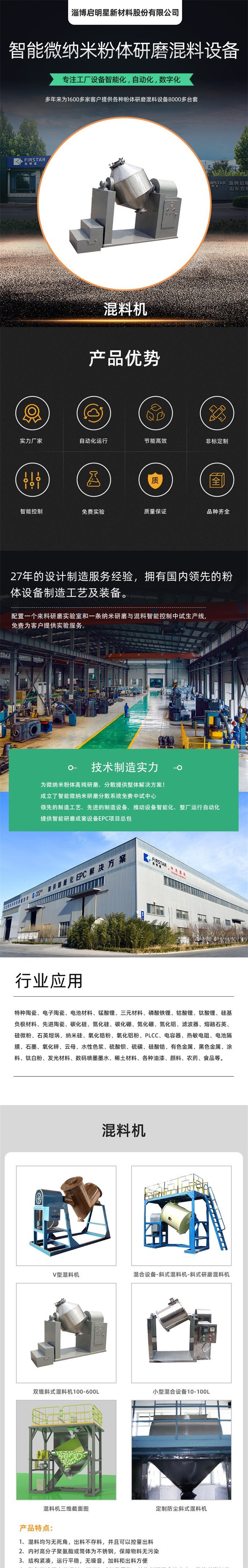 混料机是一款通用干粉混合设备,采用筒体倾斜设计,工作时物料运动无规则,从而达到混料均匀无死角,对于易团聚物料可以加聚氨酯球助混,不破坏颗粒并打散团聚。工作高效,操作简单,运营可靠,进口聚氨酯涂层无污染。配有操作平台、加料斗、护栏等辅助配件。选配变频调速、磨口自动光电定位、智能混料控制、真空加料等配置。本机适用于多种干粉混料,广泛应用于锂离子电池正极材料(钴酸锂、锰酸锂、磷酸铁锂等)、先进陶瓷、电子陶瓷、化工、医药、涂料等各领域。公司还生产微纳米全系列研磨设备,可以提供智能研磨成套设备EPC项目,广泛应用于多种行业粉体材料的高纯超细球磨和分散